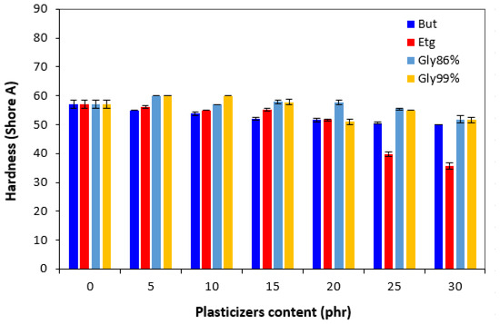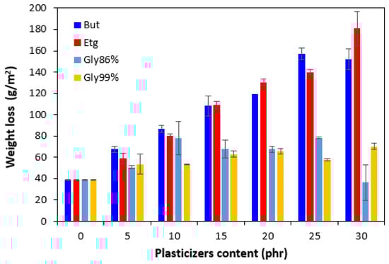 The reason for a different specific weight loss of the vulcanizates can again be attributed to the structure of plasticizers. 1,4-butanediol and ethylene glycol are less polar due to a lower amount of hydroxyl groups. On the other hand, glycerol exhibits a higher polarity and thus higher affinity with the biopolymer. A higher amount of hydroxyl groups increases the efficiency of hydrogen bond formation between glycerol and calcium lignosulfonate. Glycerol is more physically adsorbed on the biopolymer, and thus it shows a lower blooming effect.