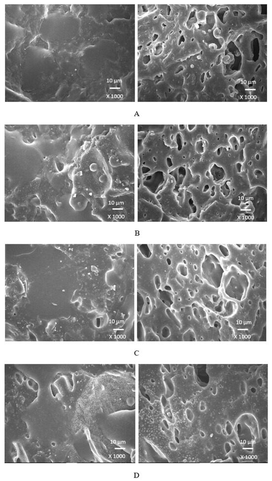 SEM images of vulcanizates with applied 1,4-butanediol: (A) reference plasticizer-free vulcanizate, (B) vulcanizate with 10 phr of 1,4-butanediol, (C) vulcanizate with 20 phr of 1,4-butanediol, (D) vulcanizate with 30 phr of 1,4-butanediol. SEM images of vulcanizates before washing in hot water are presented on the left side, while SEM images of vulcanizates after washing in boiling water are presented on the right side.