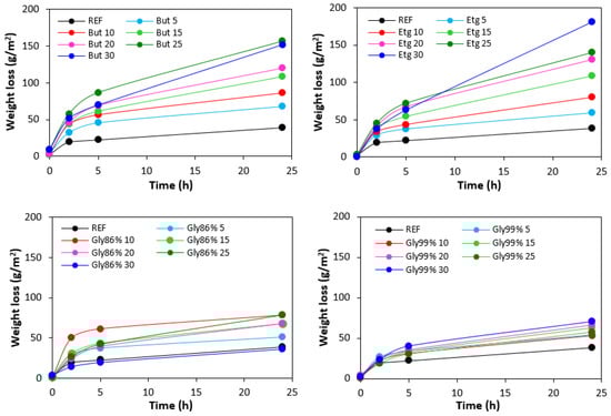 The weight loss of the samples after being exposed to 70 °C depending on the time is graphically illustrated in Figure 16, while the weight loss depending on the type and amount of plasticizers after 24 h is presented in Figure 17. It becomes apparent from Figure 17 that the lowest weight loss was exhibited by the reference sample without plasticizer. At an initial stage, the weight loss of the reference sample might be attributed to the loss of the biopolymer, which was not well bound to the surface and was wiped out with ethanol. Then, as seen in Figure 16, there was no other significant change in the weight loss of the reference sample depending on the time. However, some increase can still be caused by the wiping out of calcium lignosulfonate from the surface layer. The higher the amount of 1,4-butanediol and ethylene glycol in the rubber formulations, the higher the weight loss, whereas the type of plasticizer played no crucial role. The weight loss of the samples with lower amounts of both glycerols was also higher when compared to the reference and was very similar to that recorded for vulcanizates with lower amounts of 1,4-butanediol and ethylene glycol. But then there was no other significant change in the weight loss with the next increase in the content of glycerols. At higher amounts of plasticizers, the weight loss of the vulcanizates plasticized with glycerols was much lower when compared to the equivalent vulcanizates softened with 1,4-butanediol and ethylene glycol.