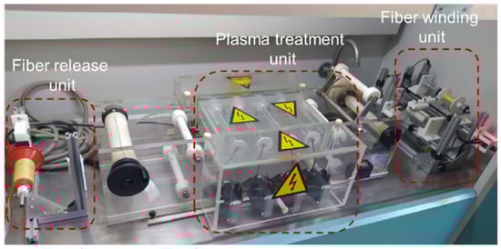 Lab-scale dielectric barrier discharge (DBD) plasma system operating under atmospheric conditions was utilized for surface modifications of aramid fibers. Lab-scale treatment system is shown in Figure 1. The plasma system was explained in detail elsewhere []. The plasma system is capable of working under both argon and air as purge gas. In this study, air was used as a purge gas. The aramid fibers were continuously passed through the system and treated at discharge power of 200 W for treatment duration of 12 s, and, finally, collected onto a spool. Spool of atmospheric-plasma-treated fiber was then placed onto 3D printer for printing process.