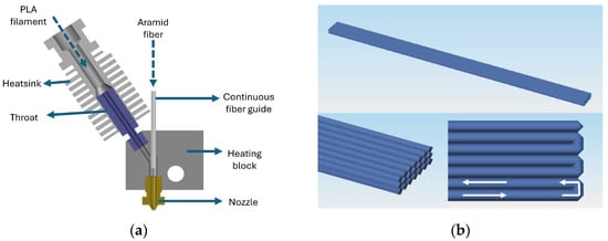 A heating block was produced for the 3D printing process of continuous-aramid-fiber-reinforced PLA composites. The reinforcement continuous fiber and thermoplastic matrix were fed into the system from separated points. By providing the melt thermoplastic infusion to the continuous aramid fiber in the heating block, continuous-aramid-reinforced PLA matrix composite lines were deposited from the nozzle. Schematic representation of hot-end system for 3D printing of continuous aramid fiber/PLA composites is shown in Figure 2a.