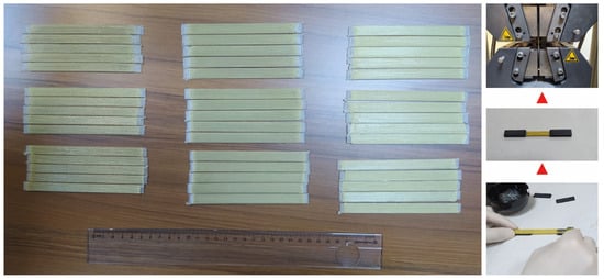 The tensile strength of composites was determined by tensile testing according to ASTM 3039 []. Unidirectional specimens with dimensions of 130 × 12 × 2.4 mm (x × y × z) were printed for tensile testing. Then, 3D-printed tabs were attached at both ends of the specimen to provide better load transfer and reduce stress concentrations at the grips. Next, 3D-printed composite specimens and preparation of tensile testing specimens are shown in Figure 4. Fracture surfaces of tensile test specimens were investigated by using scanning electron microscope (SEM; ZEISS, EVO HD15, Germany).