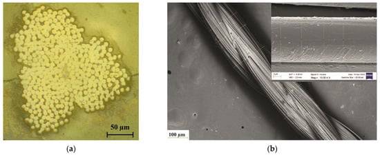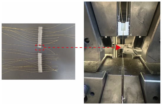 Fiber volume fractions of 3D-printed continuous aramid fiber composites were determined by using cross-sectional microstructural images []. The effect of atmospheric plasma treatment on fiber–matrix interface bonding was investigated by fiber pull-out test. For this purpose, unreinforced samples with dimensions of 5 mm × 10 mm × 5 mm (printing directions: x × y × z) were printed. When half height of the sample was printed, aramid yarns were placed in the middle of the sample straightly and the printing process was continued as proposed by Nuhoglu et al. []. Schematic representations of pull-out test samples are shown in Figure 3. Ten specimens were tested with a crosshead speed of 1 mm/min.