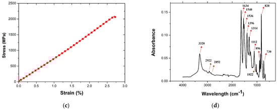 The cross-sectional image, SEM images, tensile stress–strain curve, and FT-IR spectra of aramid yarn are shown in Figure 5a–d. A piece of aramid strand was cut and immersed in epoxy resin for the optical microscope investigation. After the curing of the epoxy resin, the specimen was ground by using SiC paper of 240 to 1200 grit under water. Finally, the ground surface of the specimen was polished by using polishing paste containing 6 µm of synthetic diamond particles. As seen from the cross-sectional image (see Figure 5a), the aramid strand is made by twisting three strands. The yarn contains 420 fibers with a fiber diameter of 12.24 µm, which is measured by using an SEM image of the fiber (see Figure 5a,b). The diameter of the yarn is measured as 193.18 µm. The stress–strain curve of the aramid yarn is shown in Figure 5c. The tensile strength of the yarn is determined as 169 cN/tex. The FT-IR graph of the pristine aramid yarn obtained with a wavenumber in the range of 650–4000 cm−1 is shown in Figure 5d. The peak located at 3320 cm−1 indicates the existence of –NH groups derived from the stretching vibration on the amide bond [,,]. The peaks located at 2922 cm−1 and 2852 cm−1 are derived from the stretching vibrations of –CH– and –CH2–, respectively [,]. The sharp peak located at 1634 cm−1 corresponds to the C=O stretching vibration peak of the amide I band [,]. The peaks located at 1540 cm−1 and 1536 cm−1 are attributed to the in-plane bending vibration of the N–H group [,,]. The peak located at 1396 cm−1 is attributed to the semicircle stretching of the free hydrogen of the aromatic ring []. The peaks located at 1314 cm−1 and 1248 cm−1 are derived from the stretching vibration of the C–N of the amide II and amide III bands, respectively [,,]. The peak located at 1112 cm−1 is attributed to the in-plane deformation mode of the –C–H bond []. The peak located at 1112 cm−1 is attributed to the vibration of the C–H bond of the benzene ring []. The peaks located at 896 cm−1 and 730 cm−1 are attributed to the out-of-plane deformation modes of the N–H group. The peak located at 820 cm−1 is derived from the out-of-plane deformation mode of the –C–H bond [,].