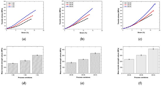 Stress–strain curves (a–c) and mean tensile strength values (d–f) of specimens printed with different layer height and hatch spacing values.
