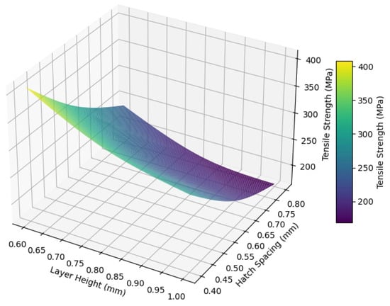 On the other hand, a narrower hatch spacing significantly contributed to a higher tensile strength, complementing the benefits of a reduced layer height. For instance, at a layer height of 0.6 mm, reducing the hatch spacing from 0.8 mm to 0.4 mm resulted in an increase in tensile strength from 237.09 MPa to 410.25 MPa. A narrower hatch spacing promotes material continuity by increasing the overlap between deposition lines, thereby reducing the porosity and enhancing the fiber–matrix interface. This ensures better load transfer and mechanical stability within the composite. The interplay between the hatch spacing and layer height becomes evident when both parameters are optimized simultaneously, emphasizing the need for a holistic approach to parameter selection in additive manufacturing. The effect of hatch spacing on mechanical properties has been frequently emphasized in the literature. For example, Hou et al. [] reported that, by optimizing the hatch spacing, superior stability and a homogeneous force distribution were achieved in continuous-fiber-reinforced energy absorption tubes. In particular, it has been stated that a 0.4 mm hatch spacing plays a critical role in improving mechanical performance. Similarly, in our study, narrower hatch spacing values were observed to increase the tensile strength, and it was confirmed that optimizing this parameter has a significant effect on the strength.