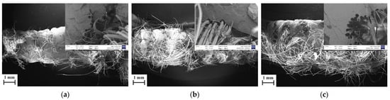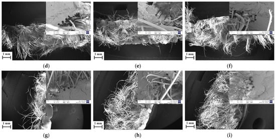 The SEM images of the failure surfaces of the samples after the tensile test are shown in Figure 9a–i. Similar failure mechanisms were observed for the analyzed fracture surfaces of the different specimens. The increase in the number of fibers is clearly seen with the decrease in the hatch spacing value and the decrease in the layer thickness value. Regardless of the printing parameters, all samples exhibited failure behavior in the form of ductile fracture with necked fibers, which is a typical fracture characteristic of the aramid fibers [,]. Another situation that can be stated as common for all samples is that the matrix penetration into the fibers is limited and the matrix penetration during the nozzle impregnation process is limited to the outer surface area of the yarn. In these regions, it is seen that the fibers which are surrounded by little or no matrix are pulled out from the matrix due to the weak fiber–matrix interfacial bonding.