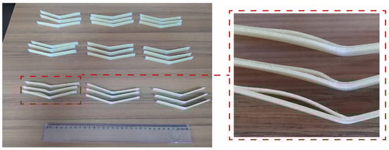 The flexural strength results of continuous-aramid-fiber-reinforced PLA composites were evaluated under varying process parameters, including the layer thickness (0.4 mm, 0.6 mm, and 0.8 mm) and hatch spacing (1.0 mm, 0.8 mm, and 0.6 mm). These parameters significantly influenced the mechanical performance of the composites. Three specimens were produced for each set of production parameters for bending tests. After the bending test, the deformed samples are shown in Figure 10. It should be noted that no fracture was observed in the samples. It is clearly seen that delamination was observed in the 06-08 samples. The layer thickness being higher than the hatch spacing value resulted in the delamination of the layers.