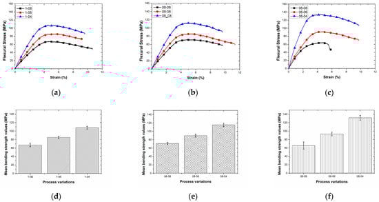 Bending stress–strain curves (a–c) and mean bending strength values (d–f) of specimens printed with different layer height and hatch spacing values.