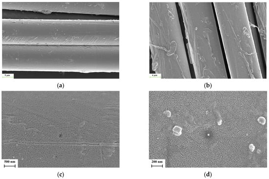 SEM micrographs which are given in Figure 12a–d show the morphology of non-modified and treated aramid fibers, respectively. A relatively clean and smooth surface was observed for non-modified fibers (see Figure 12a,c) while the atmospheric-plasma-treated fiber has an uneven surface (see Figure 12b,d). Surface etching and roughening are clearly visible in the aramid fiber following plasma treatment which is caused mostly by the bombardment of charged particles []. The surface of fibers was partially etched by the bombardment of intense electrons and ions during plasma treatment. As is indicated in the literature, the etching causes the roughening and improved adhesion between the fiber and matrix, which can be formed by the enhanced surface energy and improved mechanical properties of composites, which can be achieved by the strong mechanical interlocking of the fibers and matrix [,,].