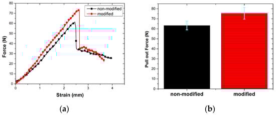 The load–displacement curve was recorded during the test and this curve is shown in Figure 15a and the mean force values are shown in Figure 15b. As seen in the curves, typical pull-out behavior is clearly seen for both the raw and modified fibers. As the aramid fiber was pulled from the tip, the load increase was observed. The load peaked and then suddenly decreased. At this point, the fibers were detached from the matrix. After this point, the load value exhibited a decreasing behavior at a lower value. This behavior was observed due to the friction between the stripped fiber and the matrix []. It is obvious that the matrix-fiber detachment peak load value increases in atmospheric-plasma-treated fibers. While the non-modified fiber pull-out load value was measured as 63.28 ± 7.31 N, the pull-out load value of the atmospheric-plasma-treated fiber was measured as 75.43 ± 6.81 N. This can be attributed to both the improvement in the matrix-bond by the change in functional groups on the surface after plasma treatment and the mechanical interlocking between the matrix and the roughened fiber surface.