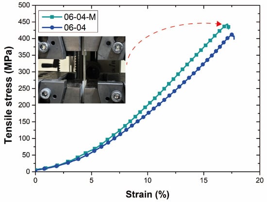 The stress–strain curves of non-modified and atmospheric-plasma-modified aramid fibers are shown in Figure 16. The mechanical performance of the 06-04 specimen, fabricated under optimized additive manufacturing parameters, serves as a reference point for understanding the effects of surface treatments on the tensile strength. The non-modified 06-04 specimen exhibited a tensile strength of 410.25 MPa, showcasing the effectiveness of a reduced layer height and hatch spacing in achieving superior fiber alignment and enhanced interfacial bonding within the composite matrix. These results highlight the significance of parameter optimization in additive manufacturing for continuous-fiber-reinforced composites.