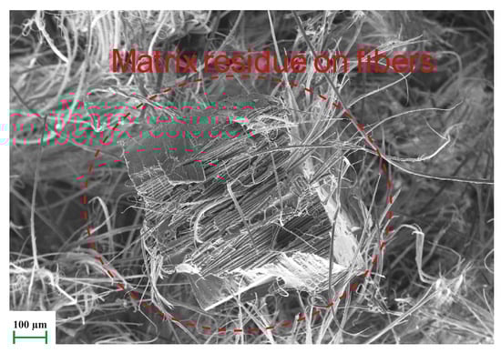 The SEM image of the damage surface of the atmospheric-plasma-treated fiber composite after the tensile test is shown in Figure 17. Although the fibers were damaged in the form of splitting and breaking similarly to the non-modified ones, the biggest difference here is that matrix residue was found on the fiber, which can be attributed to the improvement in the matrix-fiber interface bond with the plasma treatment.