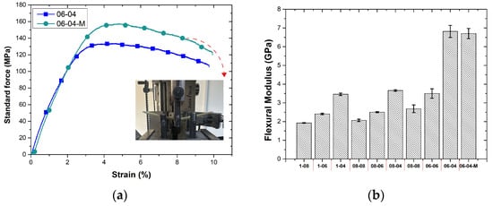 (a) Stress–strain curves of modified and non-modified bending test samples, and (b) flexural modulus of all samples (Red arrow indicates bending curve of modified composites).