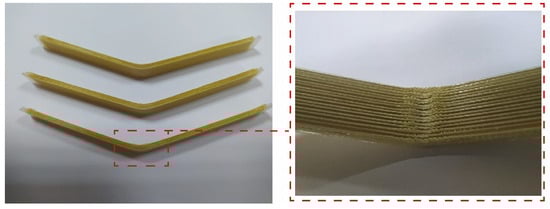Flexural properties of continuous-aramid-fiber-reinforced PLA composites were determined by using three-point bending test. Three-point bending tests were performed by using according same specimens of to ASTM D760 []; specimens were simply supported at two points and loaded at the midpoint with a crosshead speed of 1.3 mm/min and span-to-depth ratio of 20:1.
