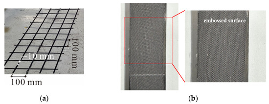 Carbon fibers were impregnated with epoxy-based resin. In the mold, the epoxy-based resin was then cured under conditions of 155 °C at the inlet, 205 °C at the center, and 205 °C at the outlet, and produced strands with a width of 10 mm and thickness of 1 mm through pultrusion. To enhance their bonding with concrete, the surfaces of the CFRP strands were embossed to increase their specific surface area (Figure 1b). Peel ply surface treatment, which imparts a textured surface formed by alternating the weft and warp threads of the CFRP strands, was applied [36]. Specifically, peel ply (polyester taffeta woven fabric, with a weight of 85 g/m2 and a maximum heat resistance temperature of 210 °C) was laid upon the outer surfaces of the CFRP strands during pultrusion and peeled off before forming the grid with the CFRP strands. The peel ply absorbed some of the epoxy-based resin and became an integral part of the CFRP strands during pultrusion. Then, by peeling the peel ply off, the epoxy-based resin was fractured, and an embossing was formed on the surfaces of the CFRP strands.