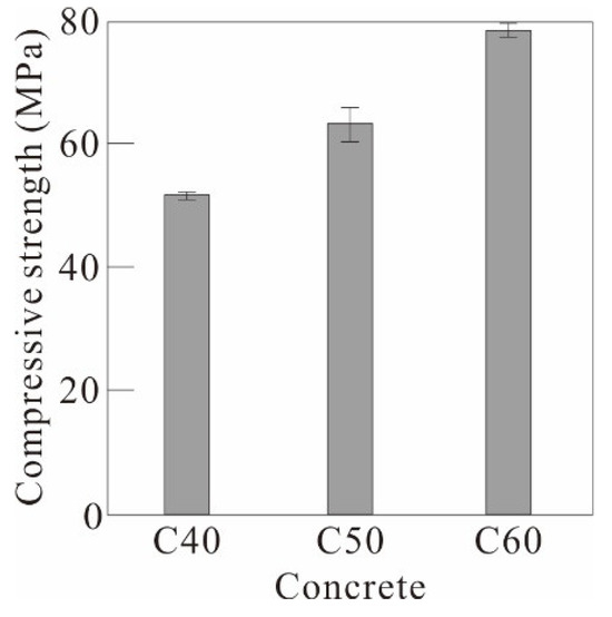 Table 2 summarizes the mix design and 28-day compressive strength of the concrete. Three types of concrete were used: C40, C50, and C60. To achieve target compressive strengths of 40, 50, and 60 MPa, the water–cement ratio of the concrete was adjusted from 38% to 25%. Coarse and fine aggregates were used according to the standard particle-size distribution specified in KS F 2527 [41] (Figure 3), with a maximum aggregate size of 25 mm for the coarse aggregate. From the results of compression tests conducted in accordance with ISO 1920-4 [42], the average 28-day compressive strengths of the C40, C50, and C60 concretes were 51.7, 63.3, and 78.7 MPa, respectively, exceeding the designed compressive strengths (Table 2 and Figure 4).