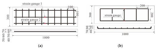 Diagrams of specimens reinforced with (a) carbon grids, (b) rebars.