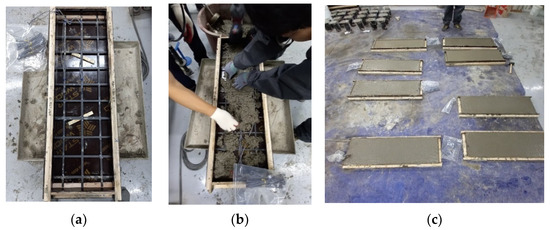To fabricate the carbon-grid-reinforced specimens, a formwork was initially placed on top of a vibration compactor, as shown in Figure 6. Wooden plates (10 mm thick) were installed at both ends of the formwork to secure the cover thickness. The carbon grid was placed on wooden plates, concrete was poured over the carbon grid, and a vibration compactor was used to ensure that the concrete filled the space below the carbon grid without any voids. The formwork was removed 1 day after concrete placement, and the specimens were cured indoors for at least 28 days. When installing carbon grids at construction sites, devices such as spacers must be installed to secure the carbon grids in place [44]. However, in this study, due to the small specimen size, wood plates were used instead of spacers to fix the carbon grid at the designed cross-sectional positions, considering the specimen size and the potential influence of spacers.