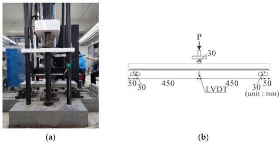 The specimens were loaded using a 1000 kN UTM at the center of the specimen in a three-point bending setup with a displacement control rate of 5 mm/min, as presented in Figure 7a.