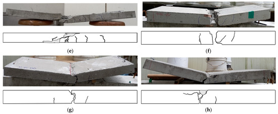Failure of specimens: (a) 40_KC_d50; (b) 40_KC_d60; (c) 50_KC_d40; (d) 60_KC_d40; (e) 60_KC2_d40; (f) 40_RC_d50; (g) 50_RC_d40; (h) 60_RC_d40.