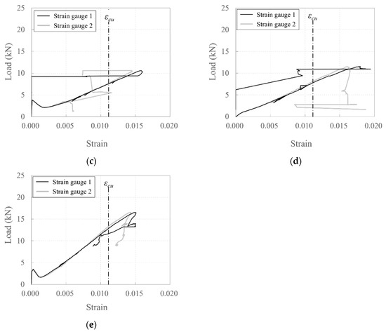 Figure 9 depicts the relationship between strain and load for the carbon-grid-reinforced specimens. The strain was measured using four strain gauges attached to the surfaces of the longitudinal CFRP strands (Figure 5a), and represents the tensile strain at the tensile strength, which is obtained by dividing the tensile strength by the tensile modulus of elasticity. The black and gray curves, respectively, represent the average strain values measured by two strain gauges attached to the surface of the longitudinal CFRP strand at the center and end positions of the cross-section (Figure 5a).