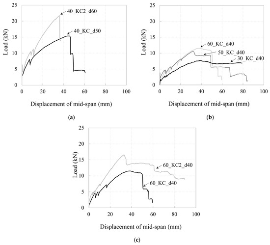 Specimen 30_KC_d40, which had the lowest concrete compressive strength, exhibited lower post-cracking stiffness than the other specimens; because the longitudinal CFRP strands did not rupture [36], the load gradually decreased in a ductile manner after reaching the maximum load until the end of the test. In contrast, specimens 50_KC_d40 and 60_KC_d40, which had relatively higher concrete compressive strengths, exhibited similar stiffnesses from crack initiation to the maximum load, although specimen 60_KC_d40 had a higher maximum load. After reaching the maximum value, the load decreased as the longitudinal CFRP strands ruptured.