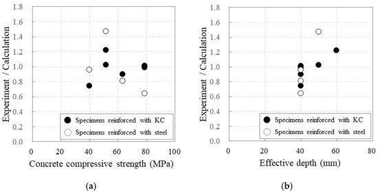Flexural strength ratios of experimental and calculation results according to (a) concrete compressive strength and (b) effective depth.