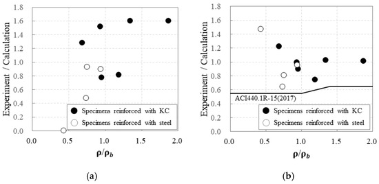 In contrast, for the carbon-grid-reinforced specimens, for those under-reinforced with carbon grids, the ratios of the experimental to calculated maximum loads decreased as the reinforcement-to-balanced reinforcement ratio increased. For those over-reinforced with carbon grids, the ratios of the experimental to calculated maximum loads increased as the reinforcement-to-balanced reinforcement ratio increased. Meanwhile, ACI 440.1R-15 [5] recommends applying strength reduction factors of 0.55–0.65 for flexural members reinforced with FRP reinforcements, considering the failure modes based on the reinforcement condition of the FRP within the section to ensure safety. From this experiment, the ratios of the experimental to calculated maximum loads for the carbon-grid-reinforced specimens range from 0.74 to 1.22 (Figure 12b), which were 1.24–2.22 times the strength reduction factor recommended by ACI 440.1R-15 [5].