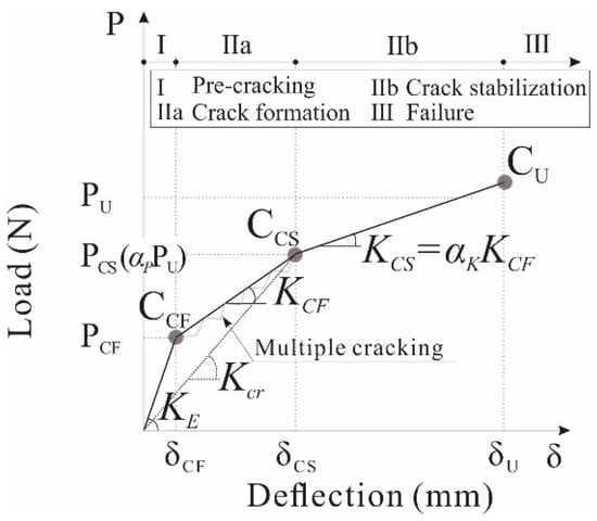 As demonstrated in Figure 18, the trilinear load–deflection curve, obtained based on the calculated characteristic values of loads, deflections, and stiffnesses for each stage according to Section 3.4.1 and Section 3.4.2, provided a relatively appropriate and accurate assessment of the flexural behavior in the carbon-grid-reinforced specimens. In Figure 18, the dashed curve refers to the load–mid-span relationships obtained using Equations (3) and (4), taking into accounting the decrease in stiffness reduction due to the weak bond between the carbon-grid reinforcements and the concrete [35], and has been shown to be applicable to the assessment of the crack formation stage behavior in the specimens. The solid curve also refers the load–mid-span relationships from the experiment (Figure 10).
