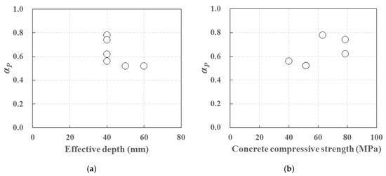 αP according to (a) effective depth, (b) concrete compressive strength.