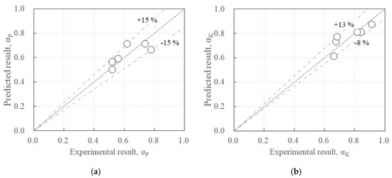 Comparison of predicted results with experimental results: (a) αP, (b) αK.
