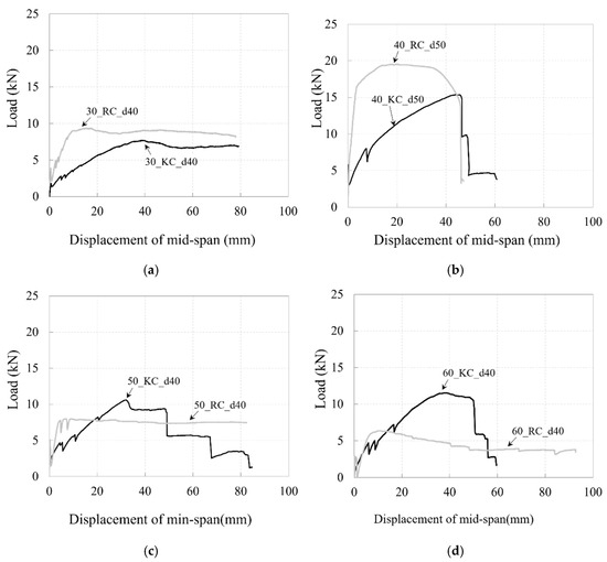 Plots of relationship between load and mid-span deflection for specimens: (a) 30_KC_d40; (b) 40_KC_d50; (c) 40_KC_d60; (d) 50_KC_d40; (e) 60_KC_d40; (f) 60_KC2_d40.