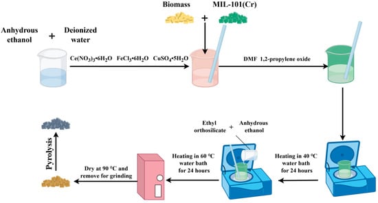 According to the calculation results of the formula, 15 g walnut shell powder, 2.214 g Ce(NO3)3•6H2O, 8.643 g FeCl3•6H2O, 1.403 g CuSO4•5H2O were dissolved in a mixed solution of 100 mL anhydrous ethanol and 20 mL deionized water. It was stirred well until the bottom of the cup had no obvious granules. Then 1 mL DMF and 15 mL 1, 2 propylene oxide were added, and it was stirred evenly to form a sol-gel state, heated it in a water bath at 40 °C for 24 h, and then a mixture of 2.7 mL ethyl orthosilicate and 0.7 mL anhydrous ethanol was slowly added to the stirring sol. After stirring evenly, it was heated in a water bath at 60 °C for 24 h, dried at 90 °C, and then taken out for grinding. The obtained powder was pyrolyzed at 600 °C and in a N2 atmosphere for 10 min to obtain 10%Fe-4%Ce-2%Cu-modified biochar.