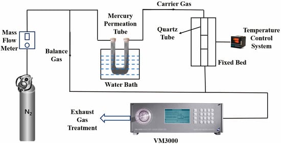 At present, coal-fired power plants do not have specialized mercury emission control devices, so the adsorbent injection method used in conjunction with existing flue gas purification equipment has become a high-concern mercury-removal technology. Direct adsorption of elemental mercury (Hg0) by adsorbents has been widely adopted at the industrial scale. The process involves injecting adsorbents into coal flue gas, capturing Hg0 via physical or chemical interactions and subsequently separating it using APCDs. Currently, activated carbon injection (ACI) is recognized as the most mature and feasible technology for mercury emission control in coal-fired power plants []. Activated carbon (AC) exhibits superior mercury-adsorption performance because of its high specific surface area and abundant surface oxidizing groups. Studies have shown that surface modification of AC with halogens and metal oxides can effectively improve its mercury-adsorption efficiency []. Nevertheless, the cost associated with mercury removal using AC is relatively high, and the addition of AC increases the carbon content in fly ash, thus affecting its comprehensive utilization. Compared with ACI technology, the fixed-bed pollutant removal technology offers the advantage of the simultaneous removal of multiple pollutants, conserves energy and resources, reduces secondary pollution, and improves economic benefits. However, the selection, regeneration, stability, and cost of adsorbents used in fixed beds pose challenges that limit their application in coal-fired power plants. Therefore, the development and utilization of efficient and cost-effective adsorbents have become priorities. In order to overcome the shortcomings of activated carbon adsorbents and achieve more efficient removal of mercury, a variety of new mercury adsorbents, such as metal oxides, modified fly ash, and metal–organic frameworks (MOFs), have been extensively studied [].