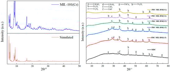The crystal structure of the adsorbent was elucidated using XRD analysis, as illustrated in Figure 3. MBC predominantly exhibits diffraction peaks for oxides of Fe, Ce, and Cu, along with their solid solutions, which increase the number of active sites on biochar, thereby augmenting its adsorption capabilities []. The XRD pattern of MIL-101(Cr) aligns with the documented references [], confirming the successful synthesis of the MIL-101(Cr) material. The XRD of the PDC-MIL/BM material obtained after pyrolysis is shown in Figure 3. It can be seen from the figure that the diffraction characteristic peaks of MIL-101(Cr) basically disappear. At an MIL-101(Cr) to biomass doping ratio of 5:1, the pyrolyzed material predominantly displays the diffraction peaks of Fe3O4, indicating that during preparation, Fe3+ ions infiltrate the pores and surfaces of MOFs and biomass. During the pyrolysis process, the MOF framework collapses, and the ligand terephthalic acid decomposes, forming an oxygen source of metal oxides together with oxygen-containing functional groups in biomass. Due to its stronger oxophilicity, Fe3+ more readily binds with these oxygen-containing groups to form metal oxides. When the doping ratio is 5:1, the limited oxygen-containing functional groups on the surface due to the lower biomass content result solely in the diffraction peak of iron oxide. As the ratio of biomass doping increases, the swelling peak of carbon material becomes more pronounced in the low-angle region, reaching its maximum at a ratio of 1:5, and displays the characteristic peaks of various metal oxides. It can be seen that the addition of biomass not only supplies rich carbon sources, to improve the porosity of composite materials, but also provides abundant oxygen-containing functional groups, facilitating the formation of metal oxides. The scant diffraction characteristic peaks of chromium oxides may be attributed to the adherence of metal ions to the surface of MIL-101(Cr) during the doping process. This adherence likely leads to the encapsulation of both MIL-101(Cr) and the formed chromium oxides during metal oxide synthesis. Furthermore, due to the brief duration of the pyrolysis time, most of the MIL-101(Cr) framework remains uncollapsed, resulting in composites characterized by metal oxides of iron, cerium, and copper encasing both MIL-101(Cr) and some chromium oxides.