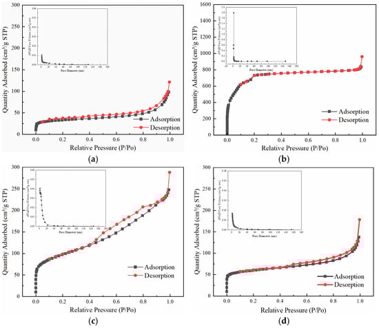 In this paper, the crystal-phase structure of the sample was characterized by a BRUKER D8 ADVANCE series X-ray diffractometer (BRUKER, Karlsruhe, Germany), and the scanning speed was 10°/min. The pore structure of the sample was analyzed by MICROMERITICS ASAP2460 specific surface and porosity analyzer (Micromeritics, Norcross, GA, USA). FT-IR characterization with Nicolet iS20 (Thermo Fisher, Waltham, MA, USA) was used to analyze the chemical functional groups on the sample surface.