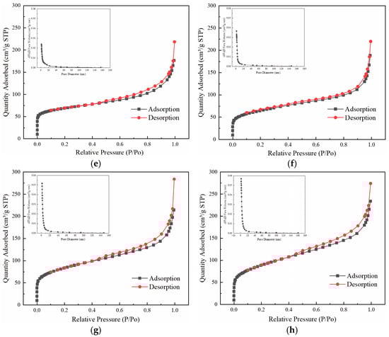 N2 adsorption–desorption isothermal curves and pore size distribution diagrams. (a) MBC, (b) MIL-101(Cr), (c) PDC-MIL, (d) PDC-MIL/BM (1:5), (e) PDC-MIL/BM (1:3), (f) PDC-MIL/BM (1:1), (g) PDC-MIL/BM (3:1), (h) PDC-MIL/BM (5:1).