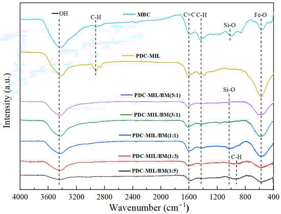 The FTIR spectra of various materials is shown in Figure 5, where 3436 cm−1 corresponds to the stretching vibration of -OH, 3000 cm−1 corresponds to the stretching vibration of the aliphatic compounds -CH2 and -CH3, 1612 cm−1 corresponds to the stretching vibration of the C=C double bond, 1420 cm−1 corresponds to the in-plane bending vibration of C-H, and 571 cm−1 corresponds to a strong absorption peak related to the stretching vibration of Metal-O. Specifically, PDC-MIL is linked to the Cr-O bond, MBC to the Fe-O bond, and the composite materials display an overlay of the Cr-O and Fe-O bonds. With the increase in the proportion of MOFs and the decrease in the proportion of biomass, the C-H out-of-plane bending vibration absorption peak at 930 cm−1 weakens and disappears when the ratio reaches 1:1. Due to the addition of ethyl orthosilicate, the absorption peak of the Si-O bond appears at 1037 cm−1, with increased intensity at an MIL-101(Cr) to biomass ratio of 1:1, and at other ratios, the absorption peak of the Si-O bond was smaller, significantly weaker than 1:1. This indicates that SiO2 is well dispersed between the MOFs and biochar under the condition of 1:1. On the one hand, the presence of SiO2 plays a role in forming a bridge between MOFs and biomass, and on the other hand, it can evenly distribute the composite materials, mitigating the volume shrinkage and metal agglomeration caused by high-temperature pyrolysis and enhancing the material’s mechanical properties. This contributes to the formation of a three-dimensional interconnected network structure and an orderly distributed pore structure, which explains the good pore uniformity exhibited by PDC-MIL/BM (1:1). Tarzanagh et al. [] found that MOFs would react with ethyl orthosilicate, the raw materials for sol-gel preparation. And the addition of MOFs can act as a catalyst to accelerate the formation of gels. This is because the catalytic properties derived from their acidic secondary building units (SBUs), where the metal in the MOFs skeleton acts as the unsaturated coordination center, are functioning as Lewis acid sites []. The C-O bond of epoxides (propylene oxide) is activated by coordination with the acidic site on the SBU. Nucleophiles in the reaction system (Cl−, H2O, NO3−, etc.) attack the less hindered carbon atoms on the epoxides, facilitating ring opening and speeding up the consumption of H+ in the solution. On the one hand, it can quickly adjust pH. On the other hand, it also plays a role in promoting hydrolysis. The acceleration of hydrolysis increases the rate of cross-linking of the hydrolyzed mixed sol, thereby improving the quality of the gel, as the skeleton remains relatively intact. The gel time is too long, which will lead to undesirable agglomeration, while very short gel time may hinder the growth of the gel’s skeleton. This also explains the reasons for the low bond energy of Si-O bonds at different ratios: with lower MOF proportions, the gel formation rate is slow, and the hydrolysis and condensation reactions are not sufficiently comprehensive, resulting in the incomplete Si-O bond structure. However, with higher MOF proportions, the gel formation rate is too fast, which may lead to local accelerated hydrolysis, followed by polymerization to precipitate, which prevents the non-hydrolyzed sol from forming a uniform gel, thus affecting the growth of the gel’s skeleton. At the same time, the hydrolyzed ethyl orthosilicate will react with the carboxyl groups in the organic ligand skeleton of MOFs, forming an ester functional group. Cross-linking polymerization occurs between MOFs and SiO2, thus better integrating the biomass with the MOFs to form interconnected pore channels. Therefore, the Si-O bond absorption peak intensity of PDC-MIL/BM (1:1) material is high, and the BET-specific surface area increases significantly with the increase in MOFs, while in other ratios, the increase in BET surface area is gradual, only increasing by 22.06 m2/g from a 3:1 to a 5:1 ratio.