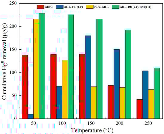 The effect of increasing the adsorption temperature on the mercury-removal performance of MIL-101(Cr) and its derived composite carbon materials is shown in Figure 6. At 50 °C, 100 °C, and 150 °C, the mercury-removal performance of modified biochar MBC has little difference, reaching 139 μg/g. However, its performance decreases significantly at 200 °C and 250 °C. Some studies have shown that a low temperature is conducive to physical adsorption, and a high temperature is conducive to chemical adsorption. At low temperatures, MBC mainly exhibits a high adsorption capacity for Hg0 due to its high mesoporous ratio pore structure. As the temperature increases, chemical adsorption begins to dominate, and the desorption phenomenon accompanied by high temperatures intensifies. MBC maintains a strong adsorption performance for Hg0 even when desorption is severe at 150 °C due to its efficient coordination of multiple metal oxides. However, as the temperature increases, desorption continues to intensify, and the removal capacity of Hg0 by MBC begins to decrease at 200 °C and 250 °C. When the adsorption temperature increased from 150 °C to 200 °C, the adsorption capacity decreased by 48.44%. As a microporous material, the adsorption capacity of MIL-101(Cr) is low at low temperatures, only 9.72 μg/g. With the increase in temperature, the chemisorption performance of MIL-101(Cr) begins to appear, and the Hg0 removal performance of MIL-101(Cr) is higher than that of MBC at 150 °C, 200 °C, and 250 °C. Due to its higher pore richness, the desorption phenomenon at high temperatures was alleviated, and the adsorption capacity only decreased by 16.67% when the temperature increased from 150 °C to 200 °C. The pyrolyzed MOFs material PDC-MIL exhibits similar removal characteristics as MBC, with higher Hg0 removal at 50 °C. However, compared with MBC, PDC-MIL has a higher specific surface area and higher mesopore ratio. The Hg0 removal performance of PDC-MIL at 50 °C is higher than that of MBC, reaching 215.82 μg/g, which is higher than other MIL-101(Cr)-derived carbon materials []. However, the shortcomings of a single metal make the adsorption performance of PDC-MIL poor. Compared with MBC, PDC-MIL has obvious performance decline at 100 °C, with a decrease of 41.14%. However, as the temperature continues to rise, the decrease in PDC-MIL at 200 °C and 250 °C is very small, 2.93% and 6.05%, respectively. This may be because compared with MBC, PDC-MIL has a more abundant pore structure and smaller average pore size, resulting in a lower escape rate for Hg0 desorption. Moreover, with the increase in temperature, the thermal diffusion effect of Hg0 in the material is intensified, and the abundant pore structure and small average pore size increase the contact probability of Hg0 with the active site in the pore, thus accelerating the reaction rate. In summary, in order to obtain high-performance Hg0 adsorbents in a wide temperature range, it is necessary to have excellent pore structure, and at the same time, it is necessary to cooperate with multiple metals to improve the adsorption performance of the material at high temperatures. PDC-MIL/BM (1:1) has both a large specific surface area and an excellent pore structure, as well as the synergistic effect of multiple metals. Therefore, it maintains a high Hg0 adsorption capacity in a wide temperature range. It not only has a 192.56 μg/g adsorption capacity at a high temperature of 200 °C but also decreases by only 10.91% when the temperature increases from 150 °C to 200 °C. The composite materials prepared by the sol-gel method not only maintain the excellent pore structure of PDC-MIL but also introduce multiple metals to improve the adsorption performance. At the same time, the participation of biomass also reduces the direct cost of mercury pollution treatment, making mercury pollution control technology more economical and practical.