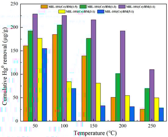 Figure 7 shows the effect of pyrolysis of MIL-101 (Cr) and biomass at different ratios on the Hg0 removal performance. As the ratio of MIL-101 (Cr) to biomass increases from 1:5 to 1:1, the mercury removal performance of the composite materials improves over the entire temperature range. This is because as the proportion of MOFs increases, the pore structure of the composite materials is optimized. Materials with excellent pore structures can meet the physical adsorption of Hg0 at low temperatures, while at high temperatures, the desorption of Hg0 can be weakened (escape rate reduced), meeting the collision probability required for Hg0 to contact active sites. The addition of multiple metals also enhances the material’s oxidation ability at high temperatures. However, as the proportion of MOFs continues to increase, the material’s removal performance of Hg0 in the entire temperature range decreases, mainly because MOFs act as a catalyst in the process of forming sol-gel. An excessive number of MOFs accelerate the formation of gel, and the growth of the skeleton structure of gel is affected. Although the specific surface area of the composite improves due to the increased proportion of MOFs, the pore structure becomes poor, and because the gel time is too fast, metal oxides and MOFs appear as an agglomeration or even precipitation. With the increase in the ratio of MOFs, the specific surface area of the composites increases slowly, remaining lower than 16.25%, which is the value when changing from a ratio of 1:3 to 1:1. In conclusion, although the composites prepared by the sol-gel method can achieve uniform mixing of multi-component systems, thus improving the homogeneity and performance of the materials, the catalytic effect of MOFs will affect the process of gel formation, thus affecting the cross-linking density, porosity structure, and functionalization degree of the composites. Therefore, an appropriate proportion of MOFs is crucial for improving the Hg0 removal performance of composite materials. In order to enhance the performance of MOF composite materials, precise synthesis control and comprehensive performance evaluation must be carried out to ensure that the material’s characteristics reach their optimal conditions.