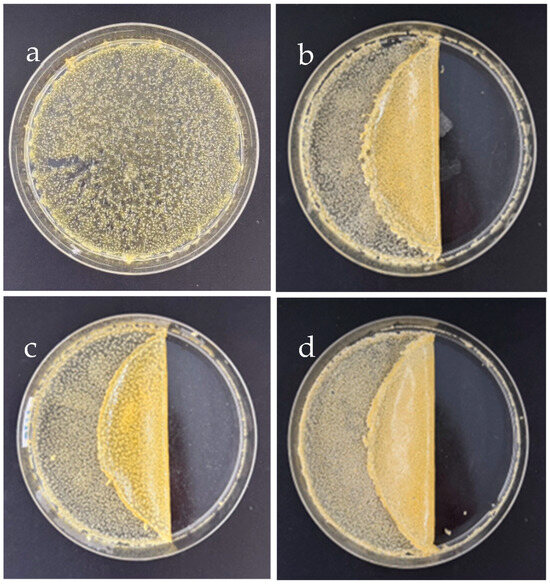 SF mixed with different concentrations of GG (0.1–0.4 g/mL) (SF–GG) was prepared to make hydrogels, as indicated in Figure 1. The obtained SF–GG hydrogels have a high moisture content and are translucent. The SF–GG (0.1) hydrogel (Figure 1a) has a thin, smooth surface and is highly translucent, but it does not form a complete texture and cannot be peeled off from the plate. The SF–GG (0.2) hydrogel (Figure 1b) clung together to form a sheet. Though it is quite soft and folds easily, the prepared hydrogel can be peeled off from the plate. When GG content was increased, the SF–GG (0.3) hydrogel, which has smoother surfaces and is more rigid, peeled off with ease (Figure 1c). All things considered, this ratio works best for producing SF–GG hydrogel that can be used and transported. Although it is thicker and less transparent, the resulting SF–GG (0.4) (Figure 1d) shares most of the same properties as the SF–GG (0.3) hydrogel.