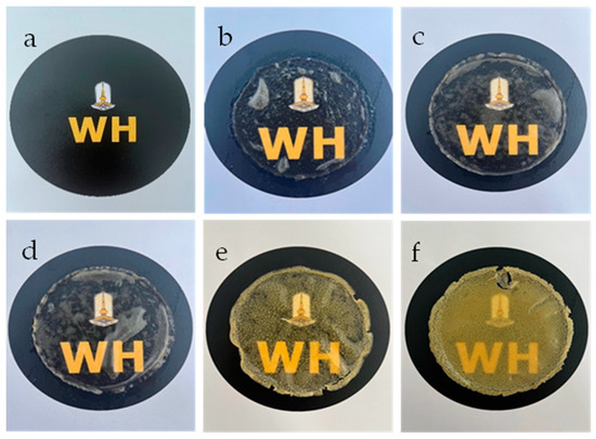 The transparency of hydrogels was easily checked by placing the prepared hydrogels on top of letters. After that, the clarity of the letters below was observed as seen in Figure 3. As SF–GG hydrogels, they have an overall appearance that is white, slightly glossy, and extremely transparent (Figure 3b–d). The homogeneous glycerol-plasticized texture indicated that the glycerol was evenly distributed and contributed to the blending of the various molecules. The SF–GG (0.3)–SB (0.3) (Figure 3e) and SF–GG (0.3)–SB (0.4) (Figure 3f) hydrogels are less transparent and have less moisture than SF–GG hydrogels. As the concentration of SB increased, transparency decreased. The transparency of all prepared hydrogels is lower than that of the hydrogel-free sample (Figure 3a).