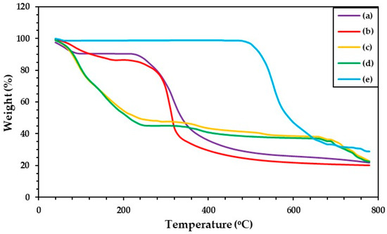 TG thermograms of different materials; SF film (a), GG film (b), SF–GG (0.3) hydrogel (c), SF–GG (0.3)–SB (0.3) hydrogel (d), and SB powder (e).