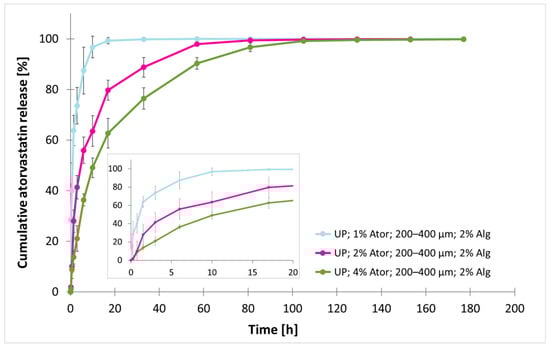 | Method | Atorvastatin content [%] | Particle size [µm] | Alginate content [%] | Cross-linker | Exponent n | |||