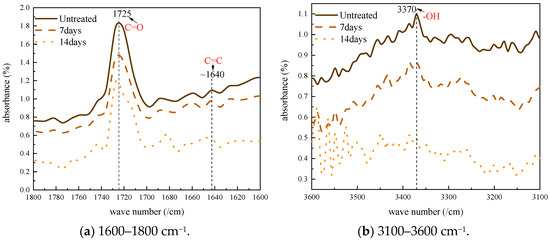 Generally, the linear molecular structure of polyethylene is chemically or physically modified into a three-dimensional network structure of XLPE to improve the thermal and mechanical properties of the material. Nowadays, the most commonly used cross-linking method is the peroxide method, which uses dicumyl peroxide (DCP) as the cross-linking agent. However, by-products are generated during the cross-linking process and remain inside the XLPE as impurities. These impurities can dissociate, generating positive and negative ions under high voltage, which migrate inside the XLPE toward opposite electrodes and form space charges near the electrodes. The space charge inside the XLPE can lead to electric field distortion and, in severe cases, even the partial discharge or breakdown of the material. Therefore, it is important to investigate the cross-linking by-products during the degassing treatment of XLPE. The absorption peaks are usually located in the ranges of 1600–1800 cm−1 and 3100–3600 cm−1, so the detailed FTIR spectra in these two typical ranges were obtained and are shown in Figure 2. The absorption peaks at 1640 cm−1, 1720 cm−1 and 3370 cm−1 correspond to the cross-linking by-products, including styrene, acetophenone and cumyl alchole chemical groups, respectively.