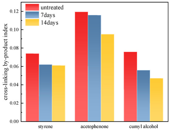 All the cross-linking by-products were found to decrease with increasing treatment times, as shown in Figure 3. The content of styrene decreased by 16.1% after 7 days of degassing and by 17.6% after 14 days of degassing compared to the untreated samples. Similarly, the corresponding decreases in content were 3.0% and 20.4% for acetophenone, and 26.2% and 40.0% for cumyl alcohol. Since the longest degassing time in this study was 14 days, the change in by-product content due to the thermal effect during cable operation was not taken into consideration [13].