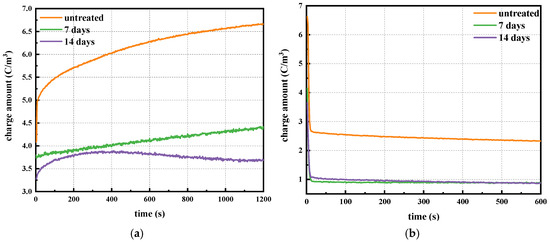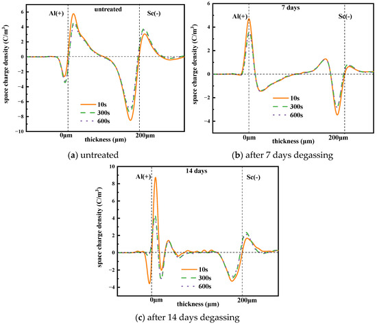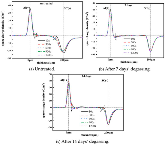 From Figure 6a, we see that the space charge amount accumulating inside the sample increased gradually over time during polarization, and the charge amount reduced significantly with the degassing time. From Figure 6b, we see that the space charge accumulation declined dramatically at the beginning of depolarization and reached an equilibrium state after a very short time. The charge density during depolarization decreased with the degassing time, with the value of 2.3242 C/m3 for the untreated sample, 0.8888 C/m3 for the 7-days degassing sample and 0.8736 C/m3 for the 14-days degassing sample.
