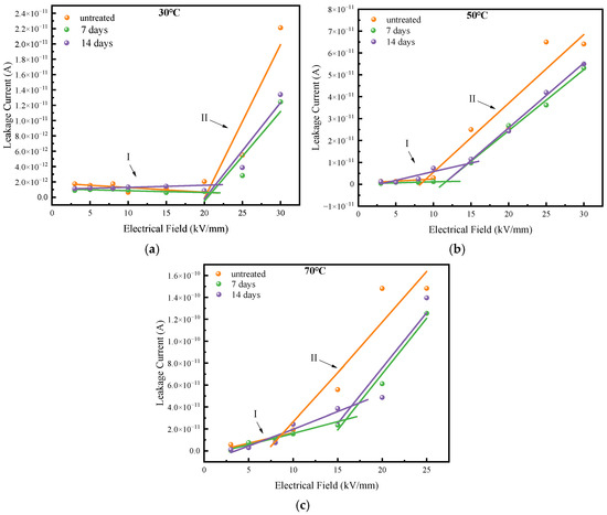 Leakage current of XLPE films. (a) Leakage current of XLPE film at 30 °C. (b) Leakage current of XLPE film at 50 °C. (c) Leakage current of XLPE film at 70 °C.