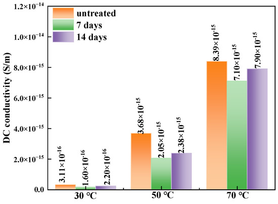 From Figure 8, the DC conductivities of XLPE samples before and after degassing are in the order of 10−16–10−15 S/m magnitude, which is in accordance with the empirical conductivity values of XLPE. The DC conductivity increases with rising temperature. Moreover, we can see that the conductivity of XLPE decreases after 7 days’ degassing treatment, and then slightly increases after 14 days’ degassing at each temperature. Compared to the XLPE sample before degassing, the DC conductivity of the samples after 7 days of degassing decreases by 48.5%, 44.3% and 15.4% at 30 °C, 50 °C and 70 °C, respectively; for samples after 14 days of degassing, the decreases in conductivity are 29.3%, 35.3% and 5.84% at the same temperatures.